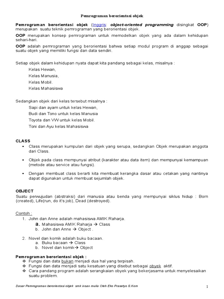 Dasar Pemrograman berorientasi objek smk insan mulia Oleh Eko Prasetyo S.Kom