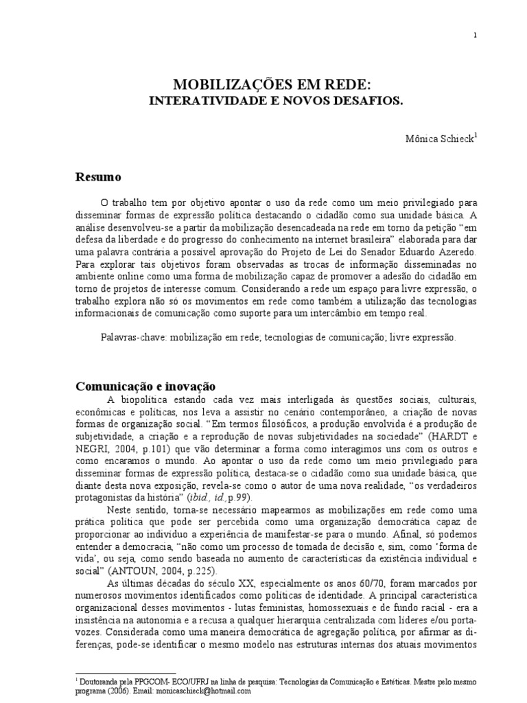Palavras-chave: mobilização em rede; tecnologias de comunicação; livre expressão.