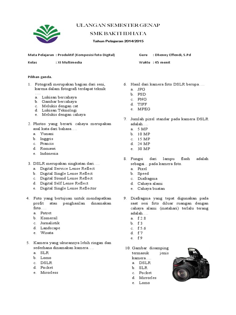 1. Fotografi merupakan bagian dari seni, 6. Hasil dari kamera foto DSLR berupa.