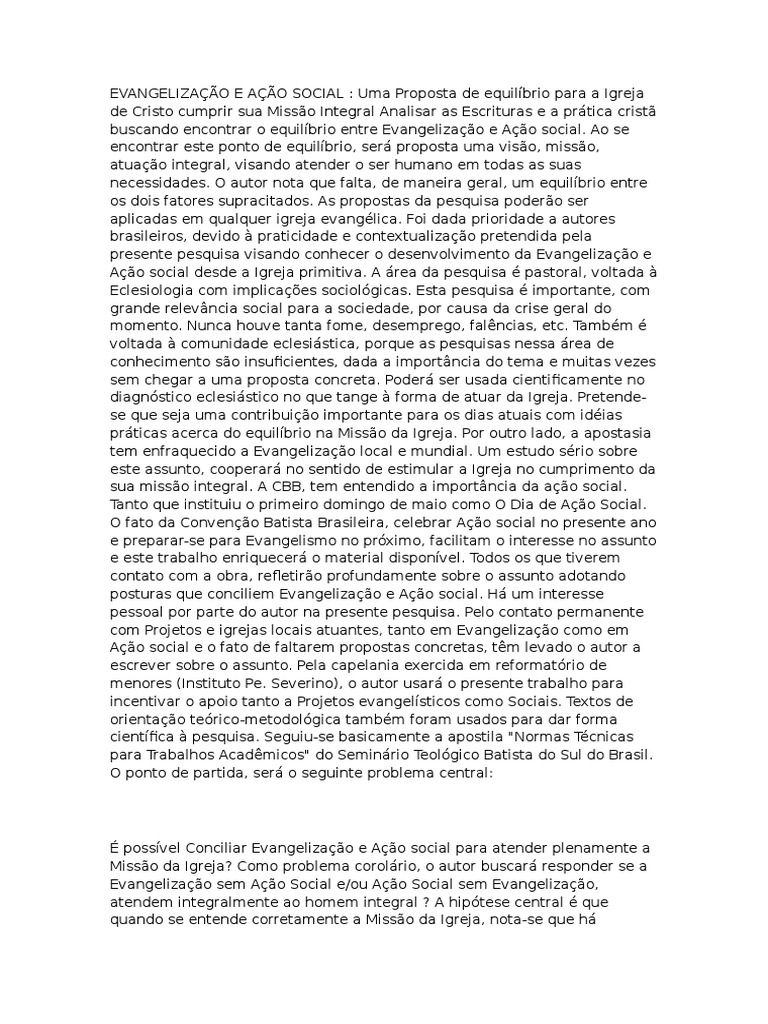 EVANGELIZAO E AO SOCIAL : Uma Proposta de equilbrio para a Igreja