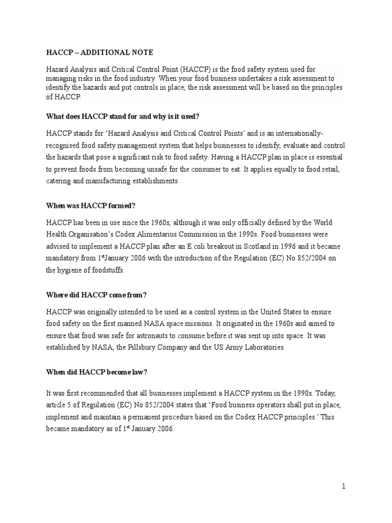 food catering, food retail and food manufacturing businesses. HACCP is an internationally-