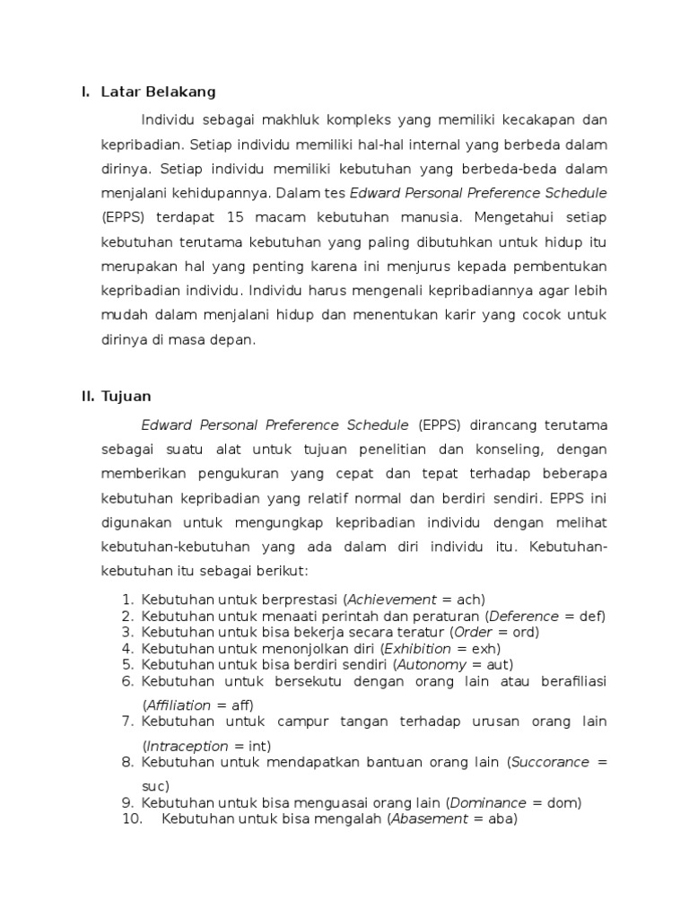 kebutuhan kepribadian yang relatif normal dan berdiri sendiri. EPPS ini