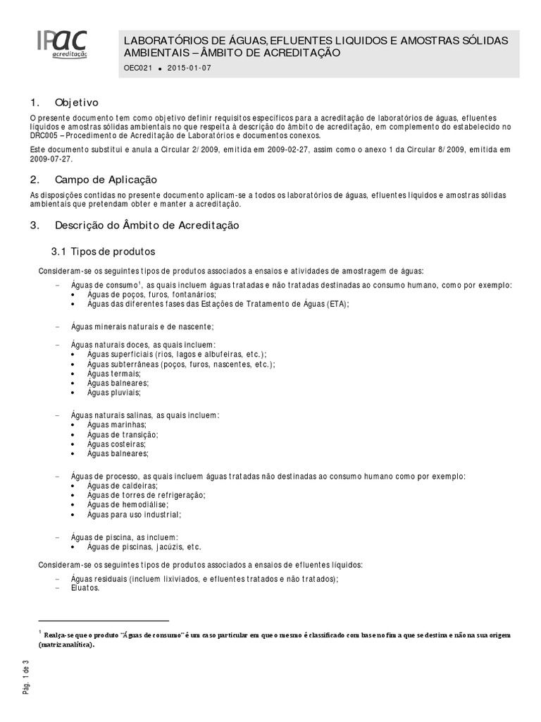 O presente documento tem como objetivo definir requisitos específicos para a acreditação de laboratórios de águas, efluentes líquidos e amostras sólidas ambientais no que respeita à descrição do âmbito de acreditação, em complemento do estabelecido no DRC005 – Procedimento de Acreditação de Laboratórios e documentos conexos.