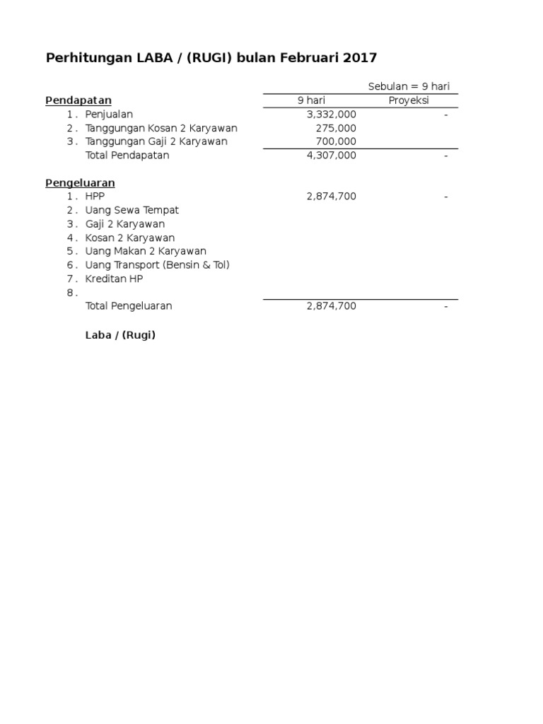 Perhitungan LABA / (RUGI) bulan Februari 2017