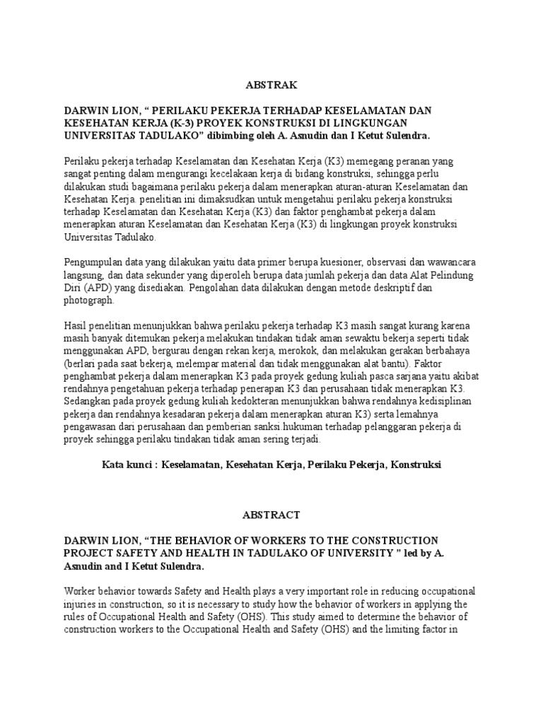 Kesehatan Kerja. penelitian ini dimaksudkan untuk mengetahui perilaku pekerja konstruksi