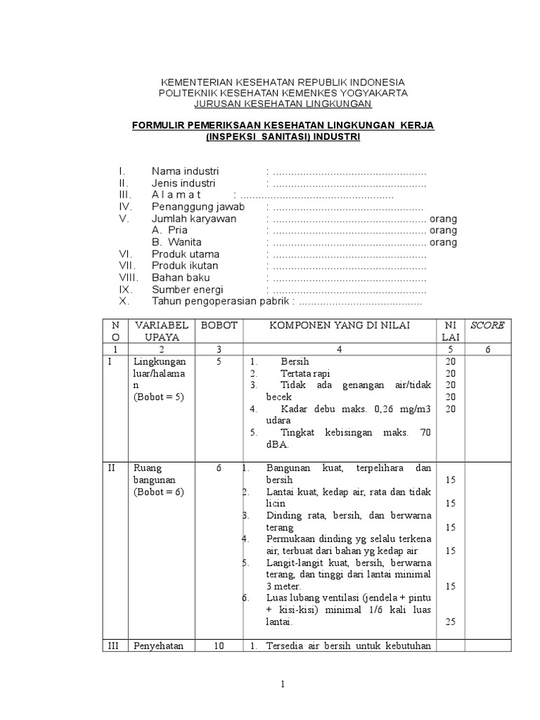 FORMULIR PEMERIKSAAN KESEHATAN LINGKUNGAN KERJA
