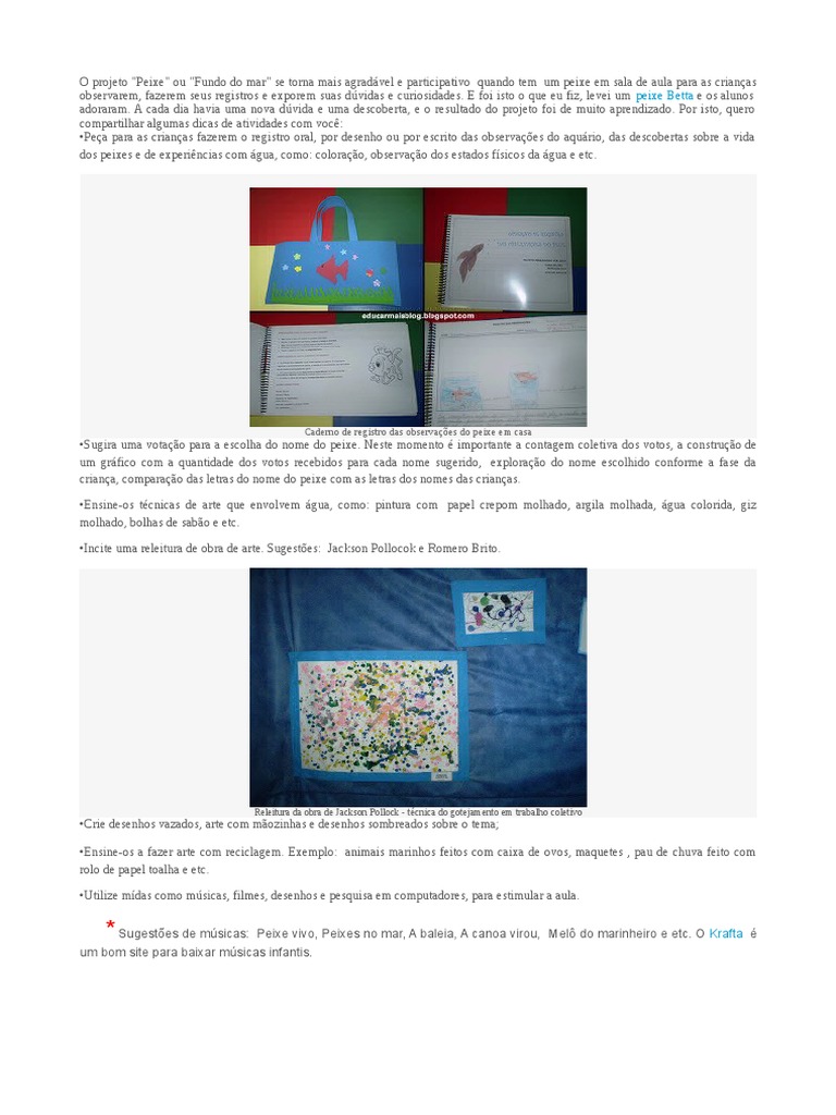* Sugestes de msicas: Peixe vivo, Peixes no mar, A baleia, A canoa virou, Mel do marinheiro e etc. O Krafta