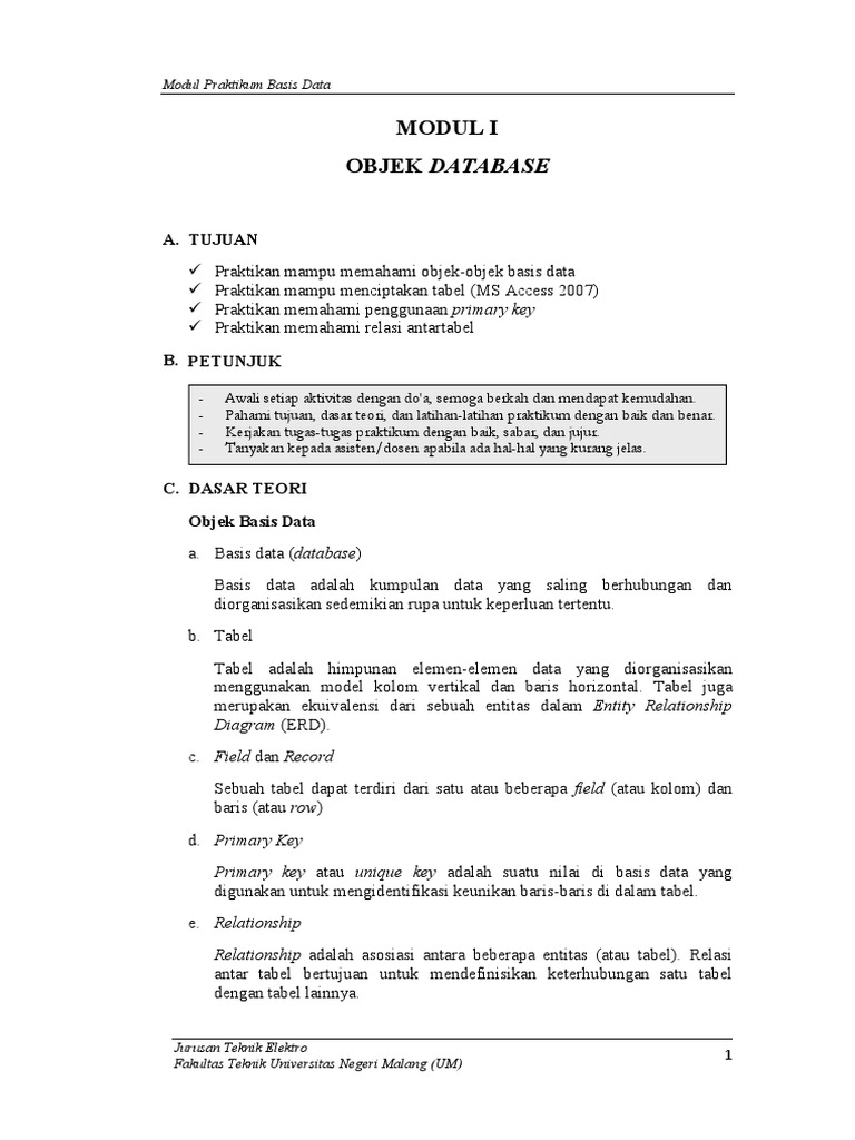 1. Buatlah sebuah basis data menggunakan Ms. Access 2007 dengan nama