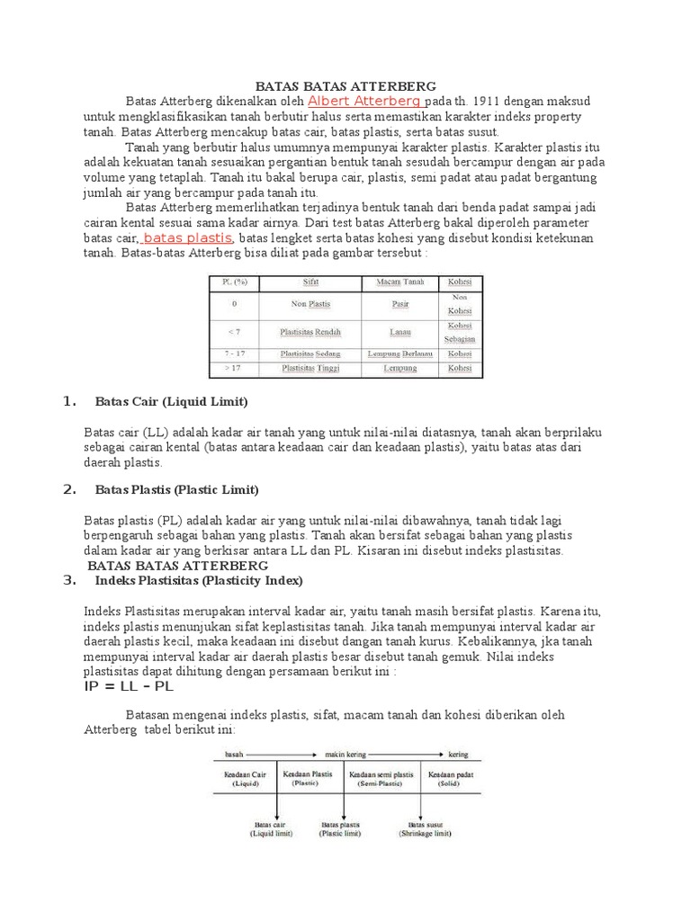 tanah. Batas Atterberg mencakup batas cair, batas plastis, serta batas susut.