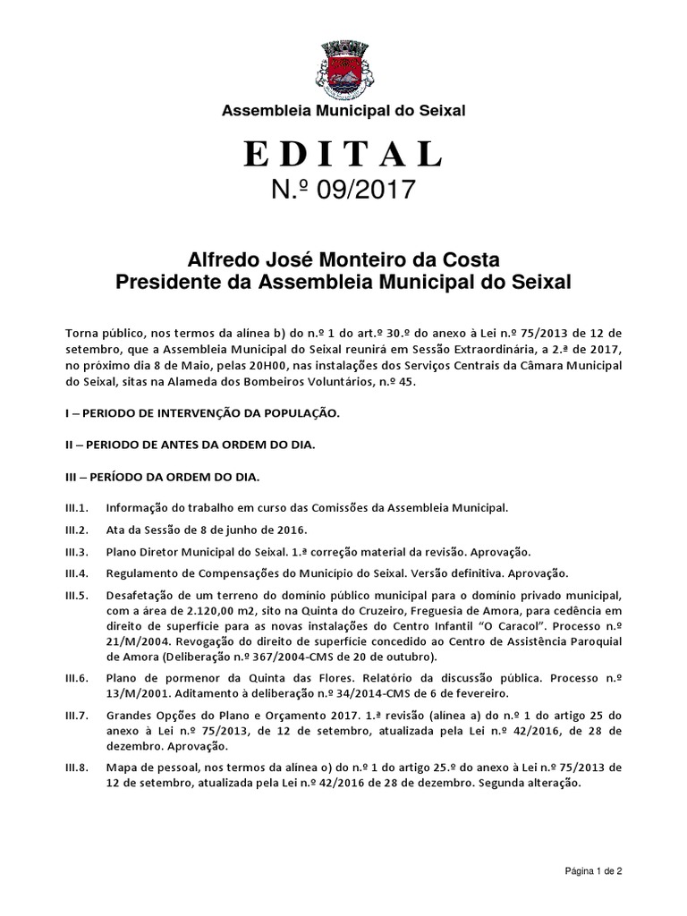 setembro, que a Assembleia Municipal do Seixal reunir em Sesso Extraordinria