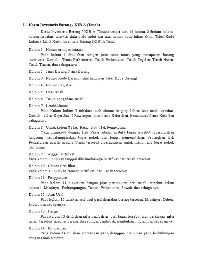 Kartu Inventaris Barang / KIB-A (Tanah) terdiri dari 14 kolom. Sebelum kolom-