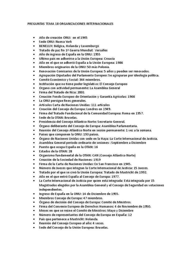 Sede del Tribunal de Justicia de la Unión Europea: Luxemburgo.Tratado de Niza de 2003 y Tratado de Lisboa de 2009. Participará en sus trabajos el alto representante de la unión para asuntos exteriores y política de seguridad. Gran Sala del Tribunal Europeo de Derechos Humanos: Lo forman 17 Jueces y se constituye por 3 años. Consejo Económico y Social. Jueces que componen el Tribunal de Justicia en la ONU: 15 jueces. Fecha en el que se fundó el Consejo de Europa: 5 de Mayo de 1949 Sede del Consejo de Europa: Estrasburgo Duración del mandato jueces del Tribunal de Justicia de la Unión Europea: 6 años ¿Quién elige a los miembros del Tribunal de Justicia de la Unión Europea?: Los Gobiernos de los Estados miembros. Institución de la Unión Europea con competencia para la iniciativa legislativa: La Comisión. Desde que fecha se encuentra España ingresada en la OTAN: 22 de Diciembre de 1997. Órganos principales de Naciones Unidas: Asamblea General. Composición del Tribunal de Cuentas: 1 nacional de cada Estado miembro. El Consejo Europeo está formado: Por los Jefes de Estado o de Gobierno de los Estados miembros. Creación de la Comunidad Económica Europea: 27 de Marzo de 1957. Sede de la Organización Internacional del Trabajo: Ginebra Número de miembros del Parlamento Europeo: 750 más presidente. Consejo de Administración Fiduciaria. 751 miembros Número de Eurodiputados que corresponden a España: 54 miembros En la Unión Europea para acuerdos internacionales se requiere dictamen conforme. Consejo de Seguridad. Miembros que corresponden a España en el Comité de las Regiones: 21 La OTAN es una organización político-militar. Acta Única Europa de 1987. Año de ingreso de España en la ONU: 1955. Tratado de Fusión de 1967. Tribunal con sede en Estrasburgo: Tribunal Europeo de Derechos Humanos. Origen de la Comunidad Económica Europea: En el Tratado de Roma de 1957. Sede Organismo Internacional de la Energía Atómica: Viena Sede Organismo Internacional del Turismo: Madrid Estados que componen la ONU: 192 Miembros del Consejo de Seguridad de la ONU: 15 miembros. Tratado de Ámsterdam de 1999. Países miembros de la OTAN: 28 . así como por su presidente y por el presidente de la Comisión. Tratado de Roma de 1958. Año conferencia de San Francisco: 1945 Sede de la Asamblea General de la ONU: Nueva York. El Consejo de Europa se creó en Londres. Tribunal Internacional de Justicia. Sede del Parlamento Europeo: Estrasburgo Principales Tratados de la Unión Europea: Tratado de París de 1952. Tratado de la Unión Europea (Mastricht) de 1993. Países que firmaron en Marzo de 1948 la Alianza Atlántica: 28 países Órgano de apoyo del Consejo de la Unión Europea: COREPER Comisarios que componen la Comisión de la Unión Europea: 27 Número de miembros que componen el Parlamento Europeo. Número votos para la obtención de la mayoría cualificada en el Consejo de la Unión Europea: 255 votos. Secretarios Generales y Secretaría.