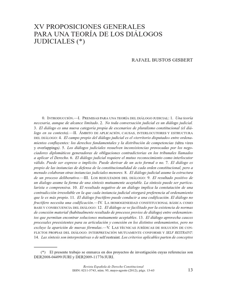 Eight descriptive propositions define the main features of constitutional-judicial dialogue today. Three preliminary propositions try to locate the main questions to be developed. structure and solution diverse from the mere comparative dialogues among courts. Judicial dialogues have their own objectives. superposiciones en la protección de dere- chos. The main thesis sustained in the paper is that judicial dialogue is a new concept/category that may solve some problems arising in situations of constitutio- nal pluralism.xv proposiciones generales para una teoría de los diálogos judiciales rafael bustos gisbert artículo es que el diálogo judicial es un nuevo concepto o una nueva categoría que puede resolver algunos problemas propios de las situaciones de pluralismo constitucional. autocontrol judicial. Palabras clave: diálogos judiciales. núm. el control ultra vires en el pluralismo constitucional. mayo-agosto (2012). minimal pro- tection of human rights. equivalent protection of human rights. Key words: rjudicial dialogues. 13-63 63 . Abstract In this article 15 general propositions are made about judicial dialogues in the con- text of constitutional pluralism. overlappings in the protection of human rights. derecho constitucio- nal comparado. Pero no toda cita de una jurisdicción extranjera puede ser considerada una forma de diálogo. pluralismo constitucional. Los diálogos judiciales tienen sus propios objetivos. But not every quotation of a foreign jurisdiction can be considered a form of dialogue. constitutional comparative Law. Four conclusive propositions summarize the ge- neral conclusions. estructura y solución. Revista Española de Derecho Constitucional ISSN: 0211-5743. protección mínima de derechos humanos. constitutional pluralism. diversos de los meros diálogos comparativos entre cortes. protección equivalente de derechos humanos. págs. 95. ultra vires control in constitutional pluralism. judicial self restraint.