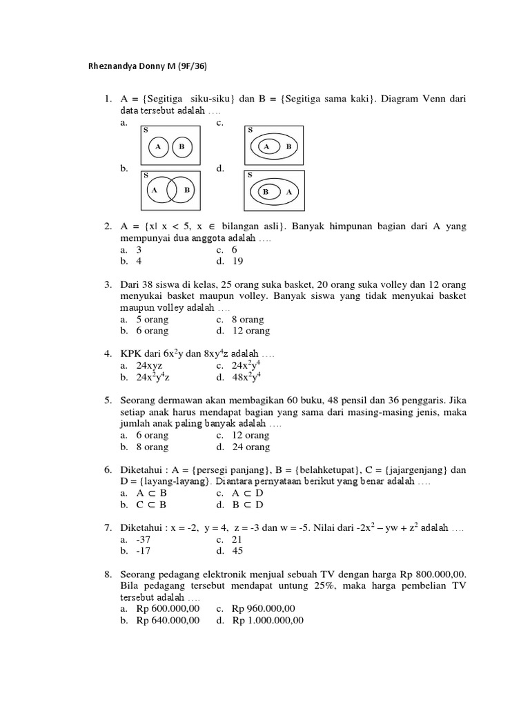 1. A = {Segitiga siku-siku} dan B = {Segitiga sama kaki}. Diagram Venn dari