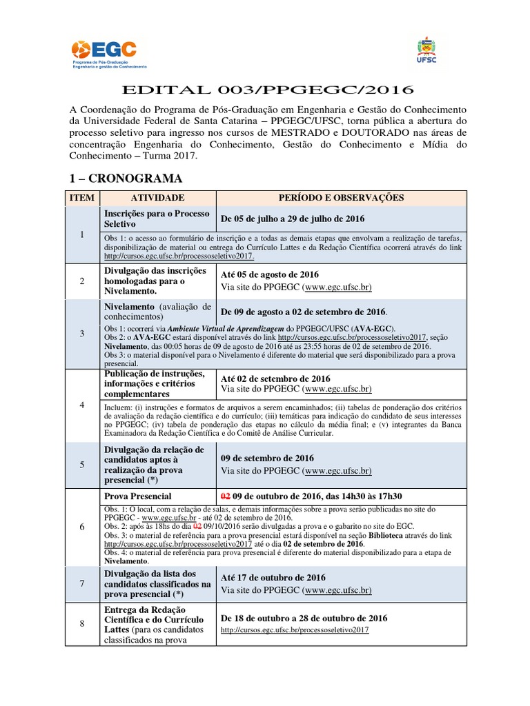 3 Obs 2: o AVA-EGC estar disponvel atravs do link http://cursos.egc.ufsc.br/processoseletivo2017, seo