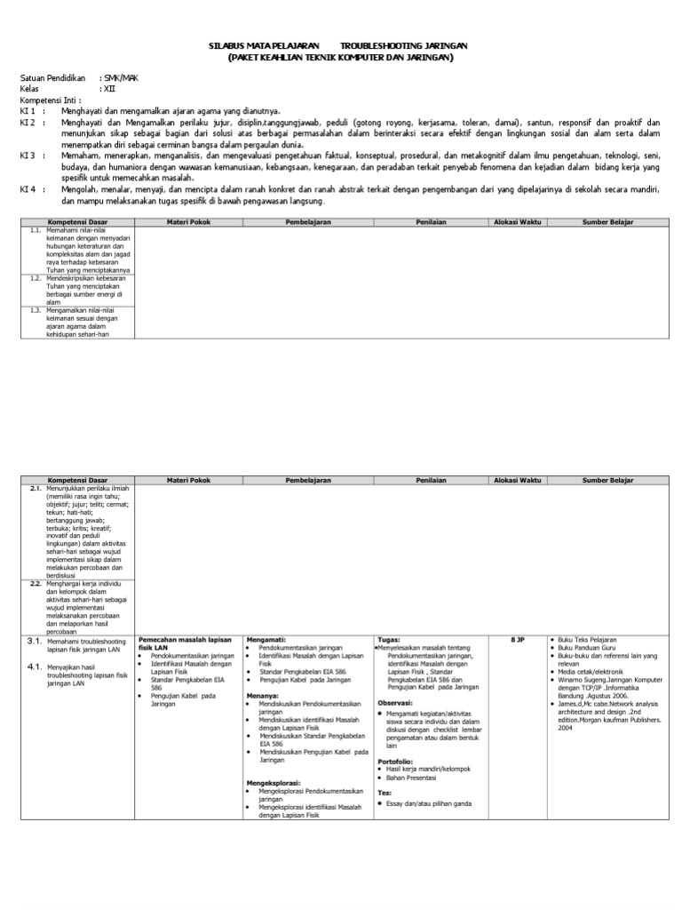 Kompetensi Dasar Materi Pokok Pembelajaran Penilaian Alokasi Waktu Sumber Belajar