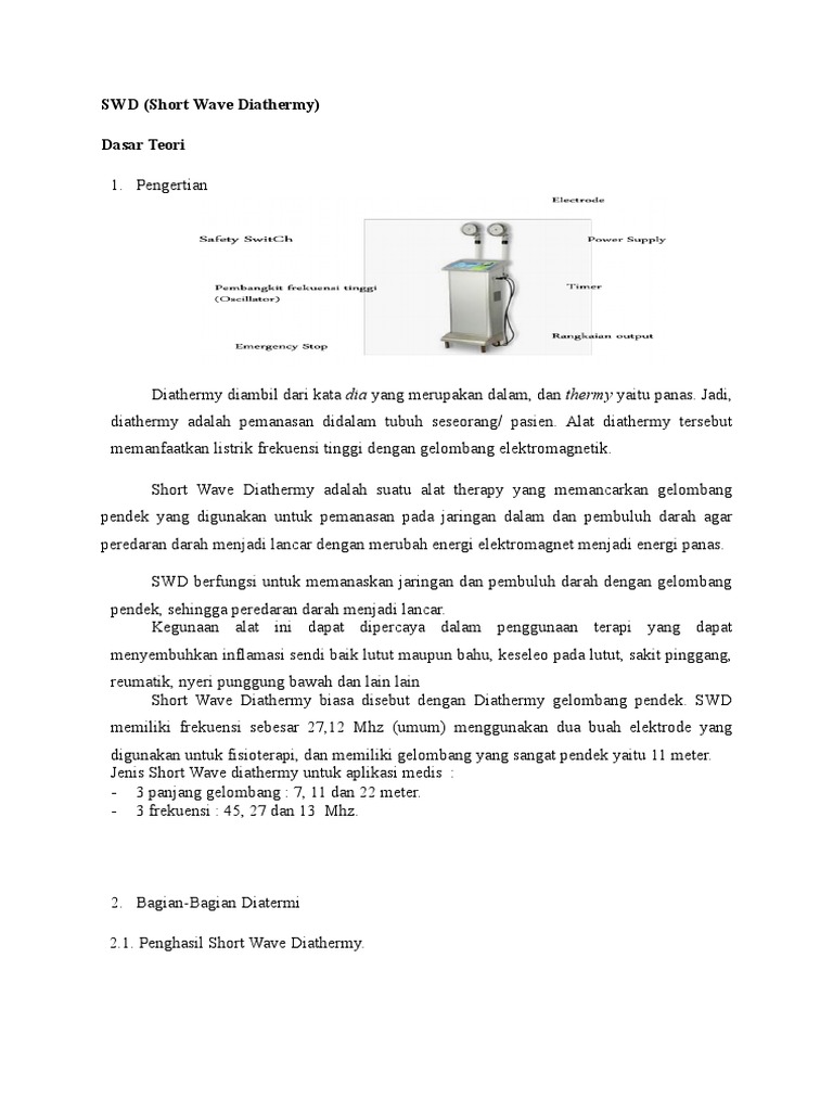 Short Wave Diathermy biasa disebut dengan Diathermy gelombang pendek. SWD