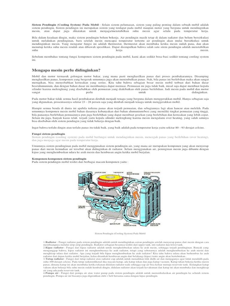 Sistem pendingin (cooling system) pada mobil berfungsi untuk mendinginkan mesin, mencegah panas yang berlebihan (over heating),