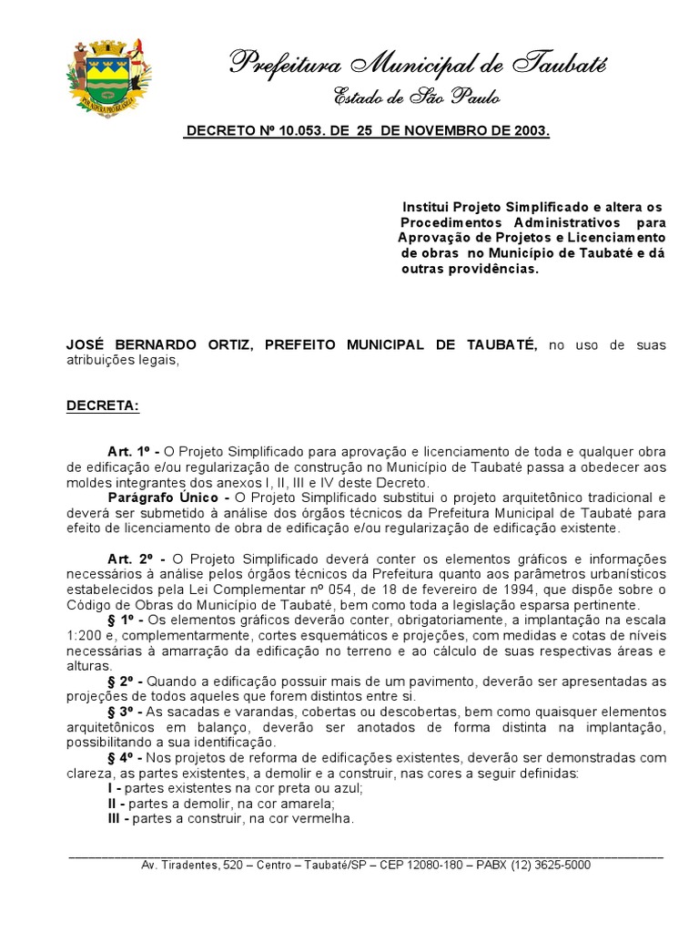 necessários à análise pelos órgãos técnicos da Prefeitura quanto aos parâmetros urbanísticos estabelecidos pela Lei Complementar nº 054, de 18 de fevereiro de 1994, que dispõe sobre o Código de Obras do Município de Taubaté, bem como toda a legislação esparsa pertinente.