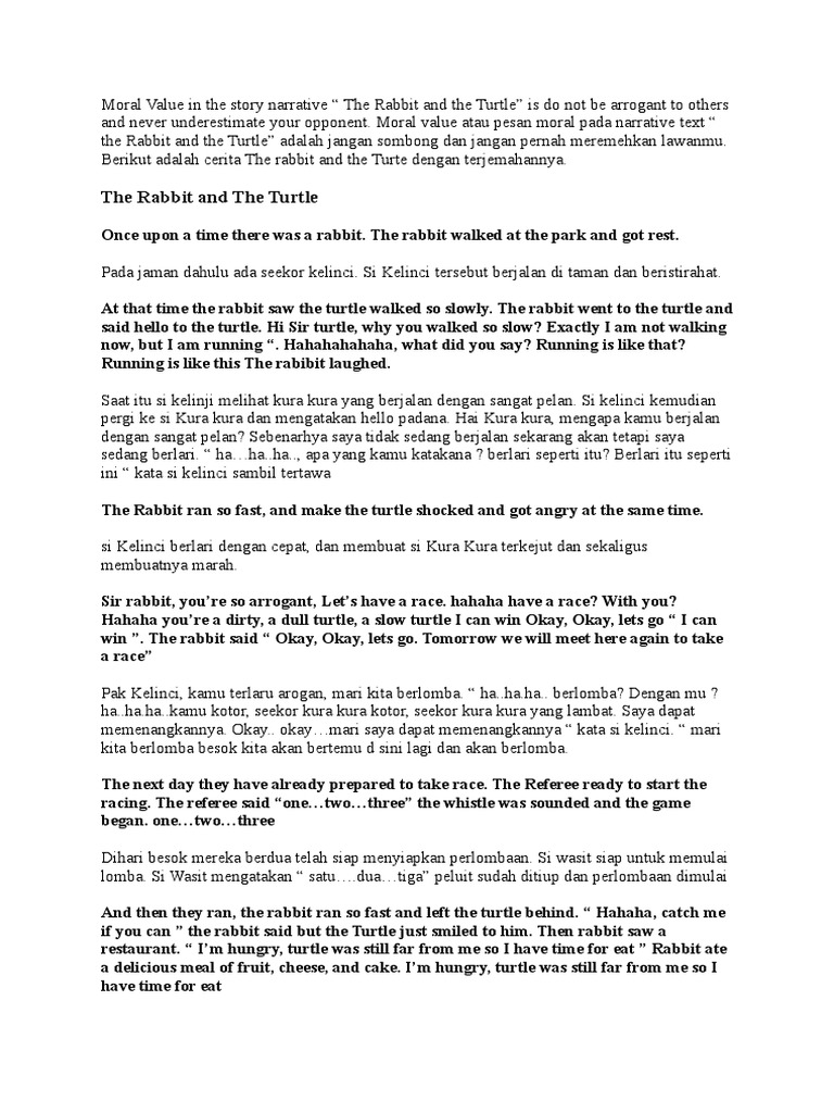 Moral Value in the story narrative The Rabbit and the Turtle is do not be arrogant to others
