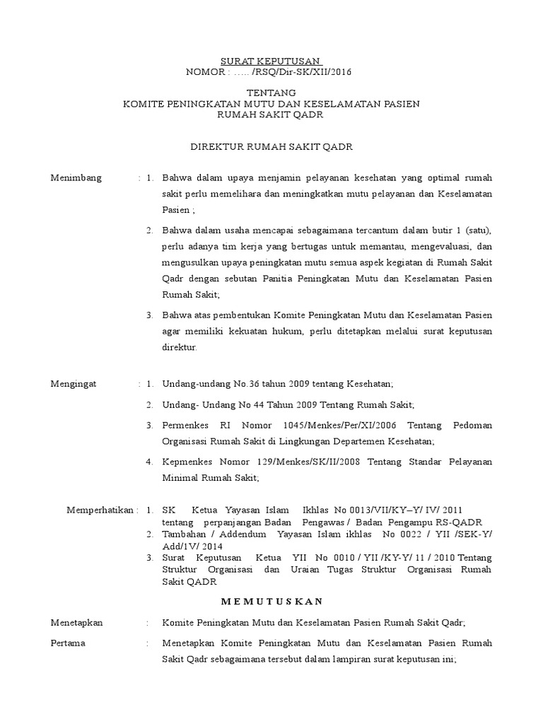 Tentang : Komite Peningkatan Mutu dan Keselamatan Pasien Mutu Rumah Sakit Qadr
