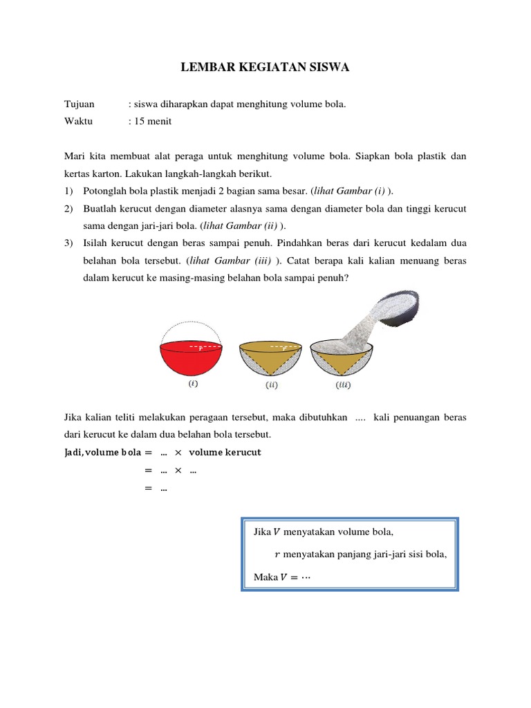 belahan bola tersebut. (lihat Gambar (iii) ). Catat berapa kali kalian menuang beras