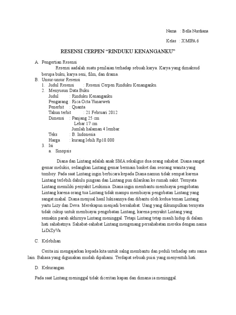 1. Judul Resensi : Resensi Cerpen Rinduku Kenanganku.