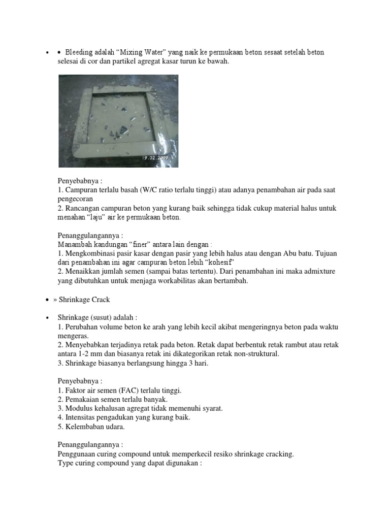 1. Campuran terlalu basah (W/C ratio terlalu tinggi) atau adanya penambahan air pada saat