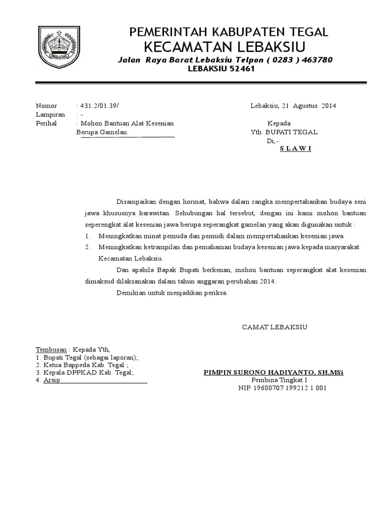 Perihal : Mohon Bantuan Alat Kesenian Kepada