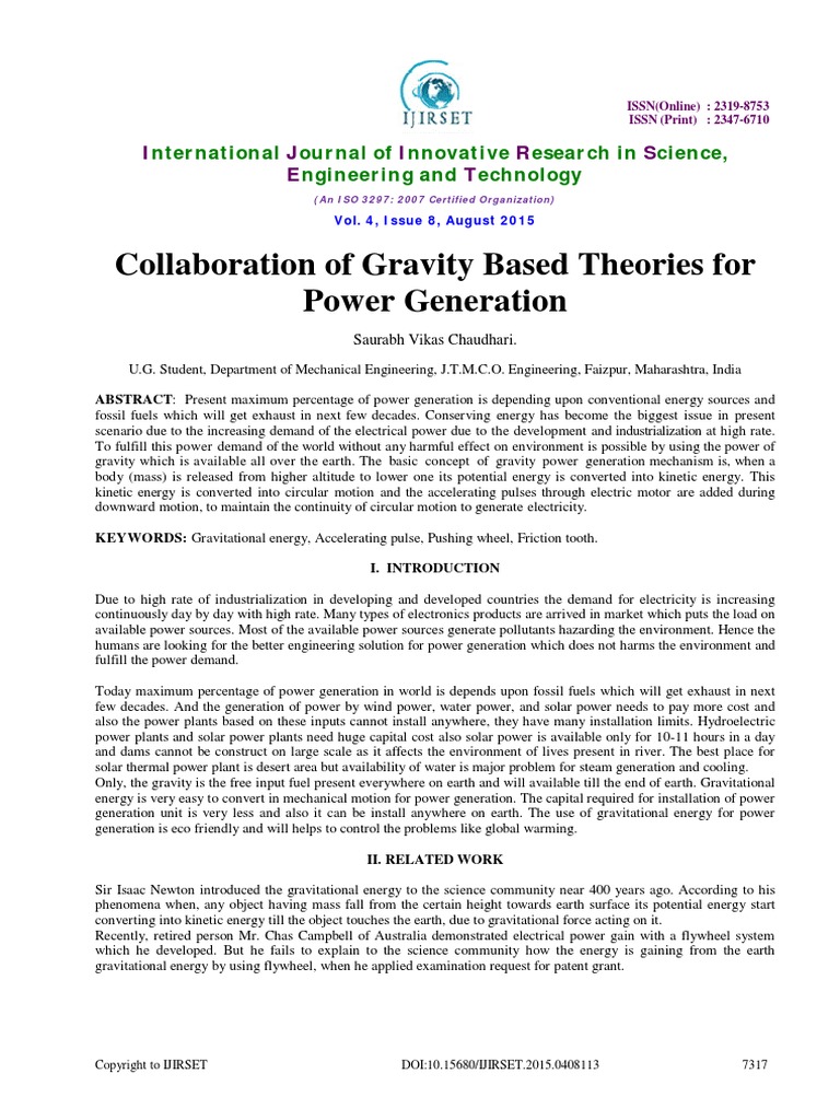 [3] Vidhan Srivastava, Sumit Chaudhary, Shailesh M. Pandey, Kulvinder Rana Gravity Power Generation IJMRSs International Journal of