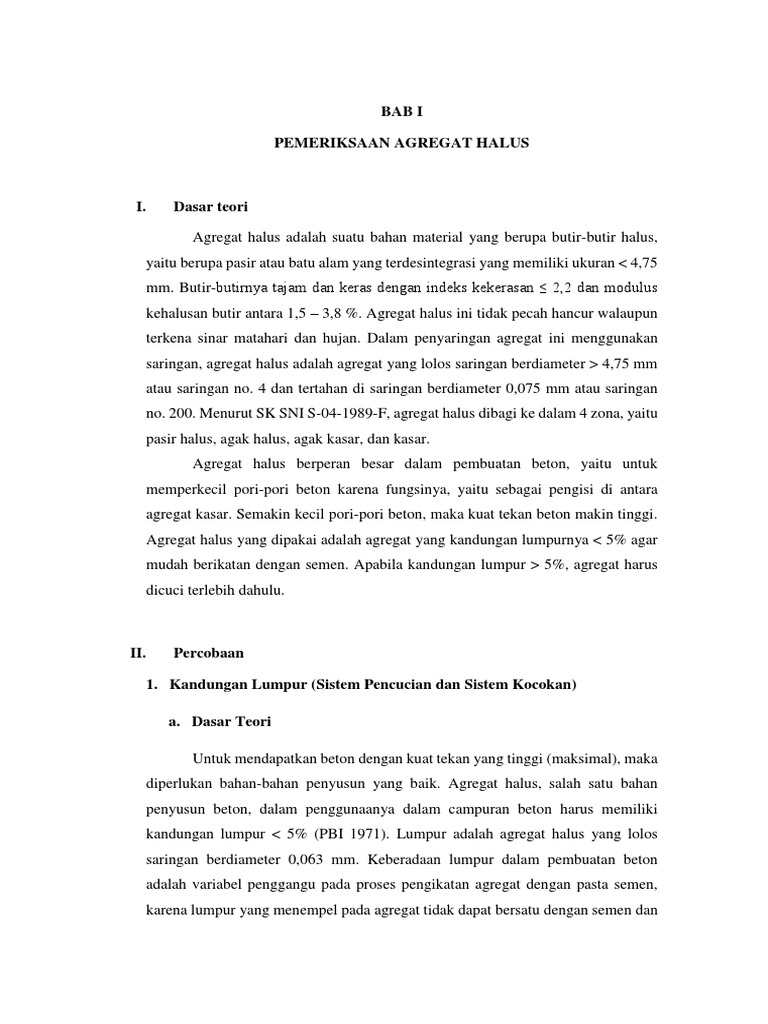 kandungan lumpur < 5% (PBI 1971). Lumpur adalah agregat halus yang lolos