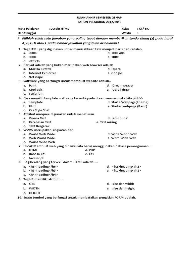 I. Pilihlah salah satu jawaban yang paling tepat dengan memberikan tanda silang (x) pada huruf