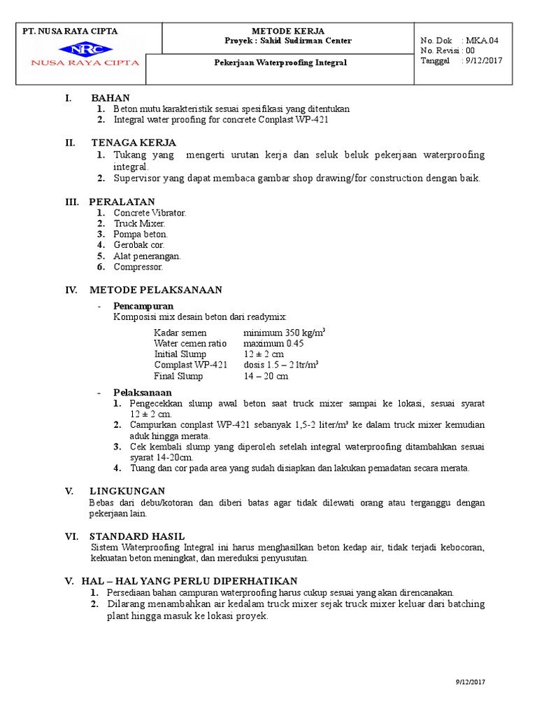 Pekerjaan Waterproofing Integral Tanggal : 9/12/2017