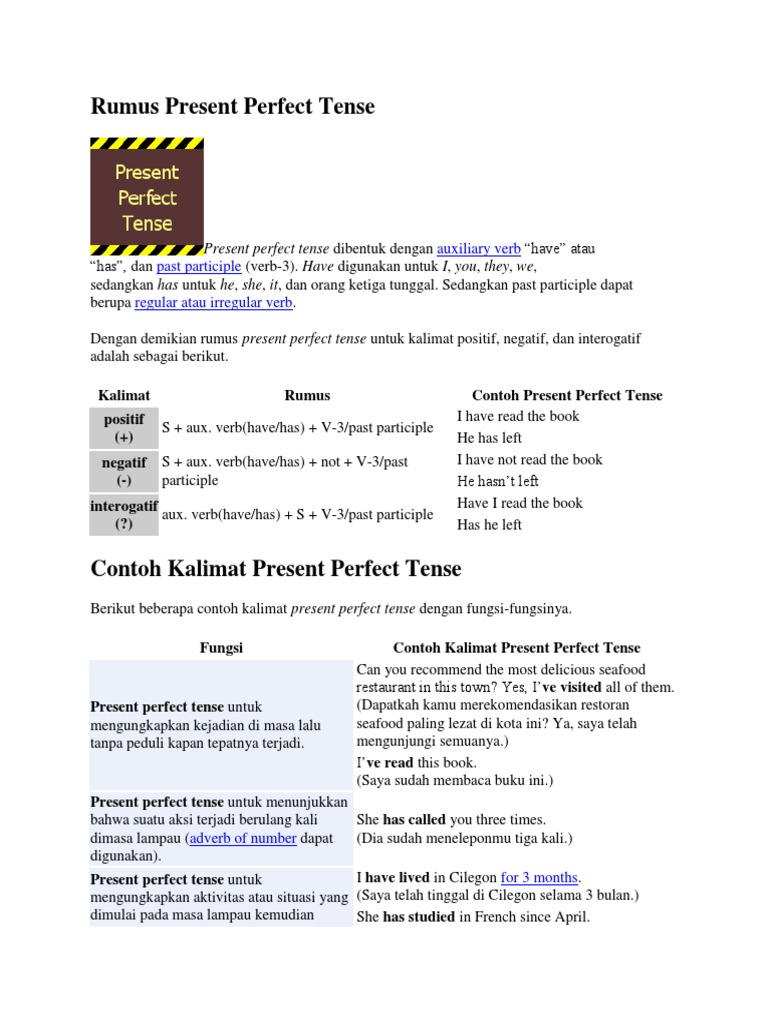 Dengan demikian rumus present perfect tense untuk kalimat positif, negatif, dan interogatif