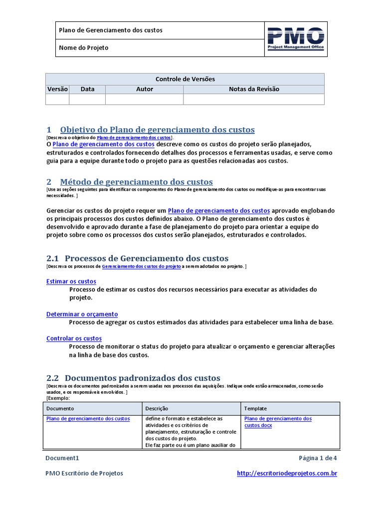 os principais processos dos custos definidos abaixo. O Plano de gerenciamento dos custos