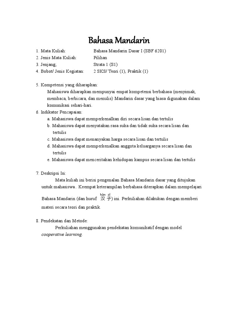1. Mata Kuliah: Bahasa Mandarin Dasar I (SBF 6201)