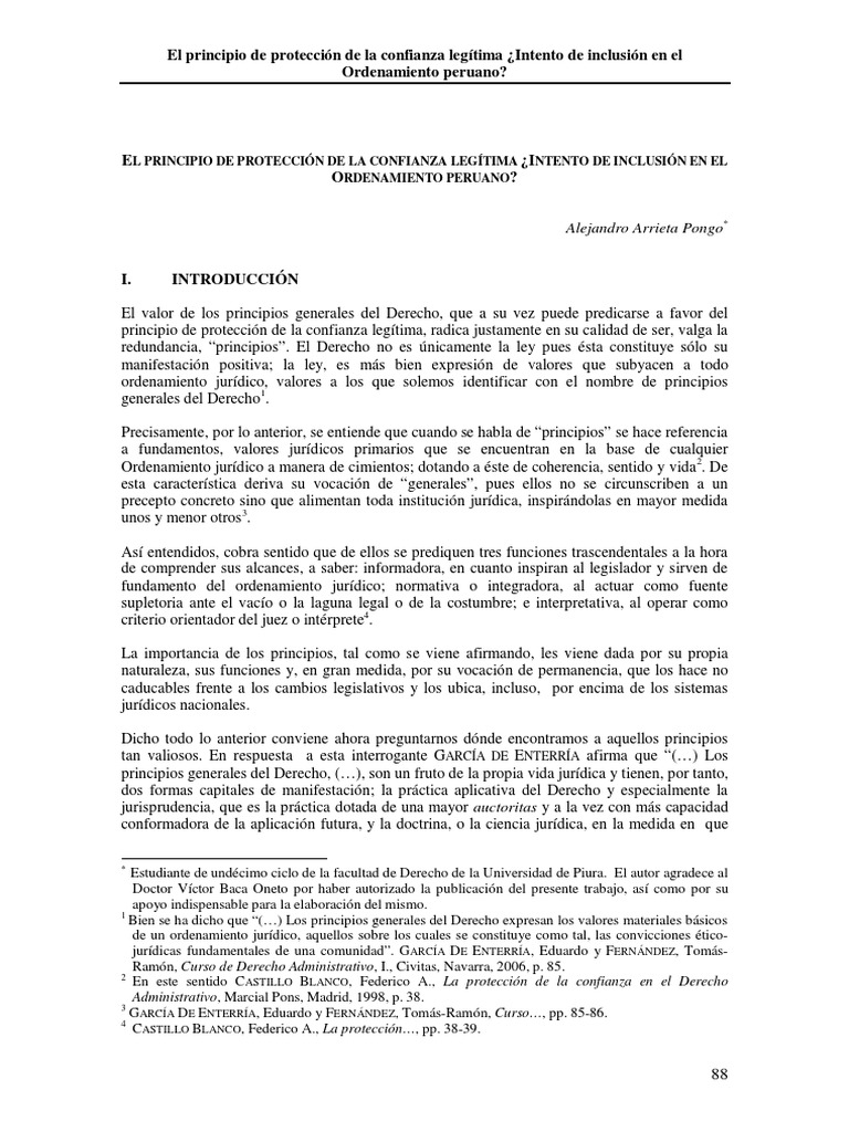 con exactitud en el derecho administrativo alemán. pp. En base a las consideraciones vertidas solo resta precisar que este trabajo ésta dirigido a analizar la doctrina y jurisprudencia comparada a fin de lograr una comprensión cabal de la importancia del principio de confianza. De este modo se ha abierto una nueva vía de atribución de responsabilidad frente a los países miembros de la comunidad cuando mediante actos administrativos o legislativos que. Tomás-Ramón. “Contenido…. Pamplona. lo incorporan al Derecho comunitario dentro del grupo de principios de la seguridad jurídica 8. además de la proximidad de ordenamientos. 6 DOMINGO. al menos en teoría. llegado el momento. 7 GARCÍA MACHO. Sobre sus Orígenes 2. Por el otro. sino iluminar el sistema institucional del ordenamiento. p. “Contenido y límites del principio de la confianza legítima: estudio sistemático en la jurisprudencia del Tribunal de Justicia”. o no. como sucede con el español. que no es la de una mera esquematización convencional del Derecho con fines expositivos o didácticos. GARCÍA DE ENTERRÍA pone de manifiesto dos fuentes tradicionales del Derecho a las cuales se puede acudir para poder acceder al conocimiento de los referidos principios. Ricardo. pp. aún siendo válidos y 5 GARCÍA DE ENTERRÍA. el cual. cuando litigantes alemanes lo aducen ante el Tribunal de Justicia7. la jurisprudencia. La protección…. Beatriz. Ricardo. dentro de éstos con especial relevancia a España10. explicar sus conexiones propias y permitir con todo ello un funcionamiento más afinado del mismo”5. Curso….1. 570. 72-73. 2001.290-291. 89 . A esta misión están consagradas las líneas siguientes. y los diversos elementos del Derecho peruano que hacen pensar. 89. se propone como el segundo modo de conocer a aquellos principios. 1258) del Tribunal Supremo. Reglas jurídicas y aforismos. Aranzadi.1. luego de ser desarrollado por el Tribunal de Justicia de las Comunidades (o Tribunal de Luxemburgo)9. Eduardo y FERNÁNDEZ. Federico A. p. El Tribunal de Luxemburgo ha reconocido al principio de protección de la confianza legítima como un principio general del Derecho que forma parte del derecho comunitario. al menos intuir por su apariencia. p. De este modo. Rafael y RODRÍGUEZ-ANTOLÍN. Todo esto con el objetivo de. Curso…. II. Pero la irradiación del reconocimiento de este principio no se va a detener pues. REDA 56. Sin duda que. Tomás-Ramón. la práctica de los jueces esta dotada de la mayor auctoritas¸ no en vano existe el principio iura novit curia6. 96. Es justamente el “valor” de los principios generales del Derecho el que inspira la necesidad de estudiar un principio desarrollado en el derecho comparado de manera rigurosa. 8 GARCÍA MACHO. Eduardo y FERNÁNDEZ. se va proyectar a varios países europeos. 9 Sobre el origen alemán de principio. o arte del derecho.1. junto con la doctrina. la ciencia jurídica de quienes conocen el ars iuris. 10 GARCÍA DE ENTERRÍA. EL PRINCIPIO DE PROTECCIÓN DE LA CONFIANZA LEGÍTIMA 2. pp. en CASTILLO BLANCO.. 561-562. CASTILLO BLANCO comenta la Sentencia de 1 de febrero de 1990 (Ar. que no es un principio totalmente ajeno a nuestro sistema jurídico. analizar el ordenamiento peruano y explorar las posibilidades de su inclusión. La jurisprudencia alemana y el Tribunal de Luxemburgo Explica GARCÍA MACHO que el principio protector de la confianza legítima tiene su origen en el derecho alemán. Alejandro Arrieta Pongo ésta cumple con su función propia. Por un lado destaca el arte de la prudencia en la determinación de lo justo. 1987.