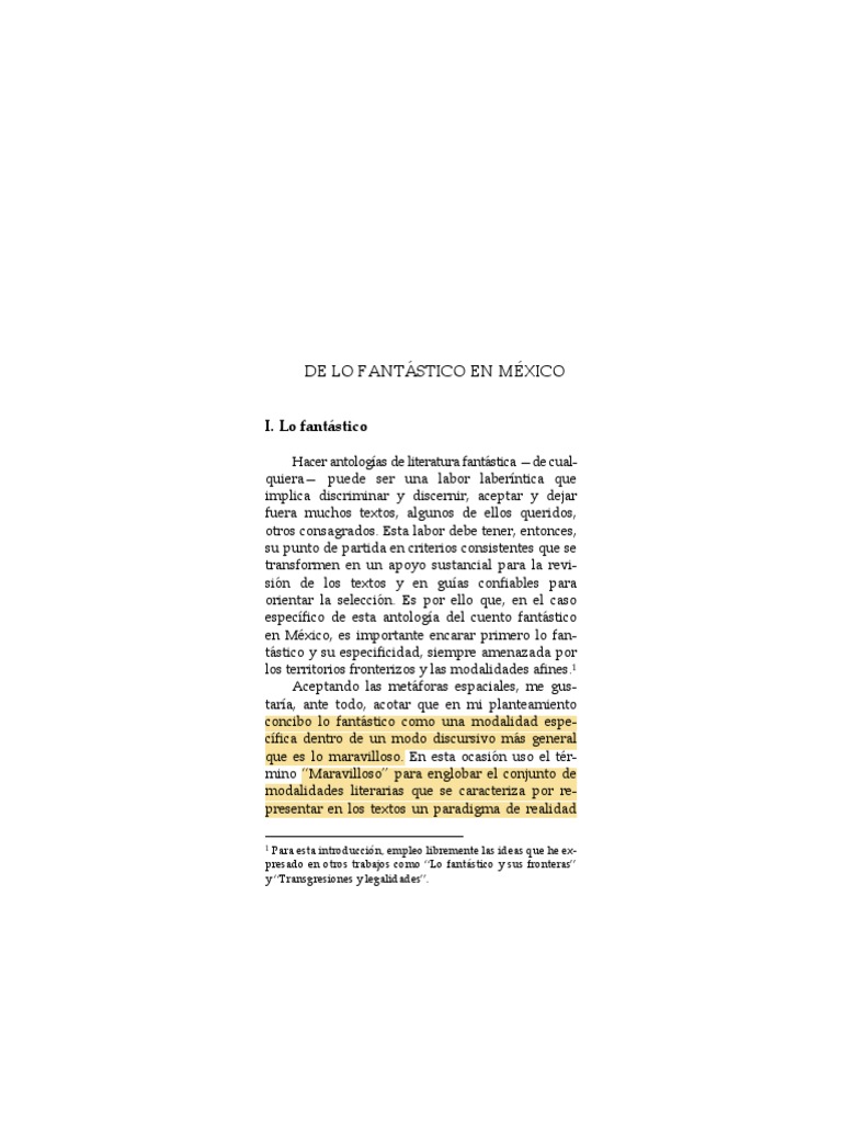 la dia- crónica y la sincrónica.temático y aceptar que muchos textos. pero son. conocida y mimética es sólo eso. II. propiamente di- cho —un subconjunto o modalidad específica—. una unidad mayor—. están construidos dentro de sistemas discursivos de lo maravilloso —entendido como un conglomerado de maneras de expresar en literatura los distintos registros de la irrealidad y lo posible. sino también que han sido capitales para su reco- nocimiento e incluso para su formulación como elemento vital en la construcción de canon de xvii . también. una ilusión y que la desazón —el signo de este discurso— siempre aparece testimoniada. del marco que cada texto ancla en su realidad extratextual y que construye la delimitación de cuando un fenómeno es lo sufi- cientemente anómalo para poder ser sancionado por ese sistema de leyes como no aceptable. a pesar de los cam- bios. pero no de lo fantástico. sutiles o no. que la ilusión del paradigma de realidad confiable. por más que nos gustara ampliar el campo de estudio. Es por ello que. lo fantástico sólo cobra su verdadera dimensión en un recorrido histórico que dé cuenta de evoluciones. constataciones puntuales de cómo de tema en tema y de frontera en frontera. quizá la constante más evidente sea que lo fantástico se crea casi siempre en la íntima conciencia de que los narradores son creíbles sólo apenas. en una doble perspectiva. cam- bios y rupturas de sentidos y valencias culturales y que permita constatar que el aire de familia sub- siste en los textos a pesar de las metamorfosis que los temas y los motivos sufren. transformaciones. Las formas en que esta modalidad ha aparecido en la literatura pueden ser diversas. En México Sabemos que las antologías constituyen no só- lo una sólida tradición en el campo de lo fantástico.
