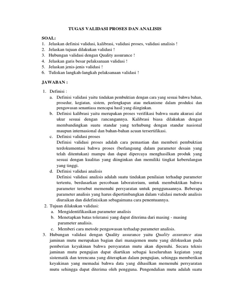1. Jelaskan definisi validasi, kalibrasi, validasi proses, validasi analisis !