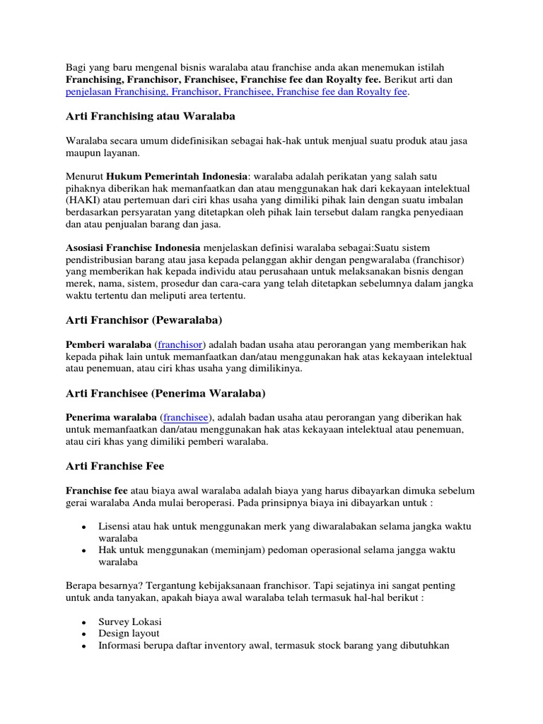 Franchising, Franchisor, Franchisee, Franchise fee dan Royalty fee. Berikut arti dan