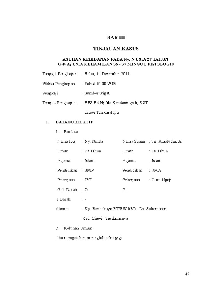 G2P1A0 hamil 36 - 37 minggu fisiologis.