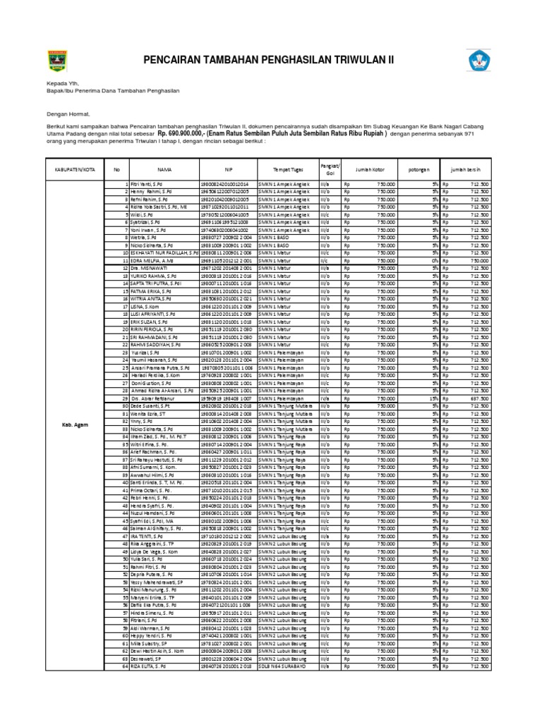 891 ELVINA, S.Pd 19760529 200604 2 014 SMA N 3 SAWAHLUNTO III/c Rp 750.000 5% Rp 712.500
