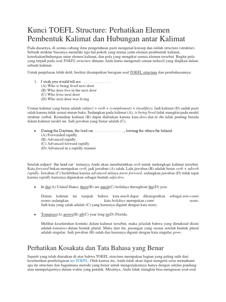 dengan tepat. Namun, pada pengamatan pada saat tes, ada beberapa Materi TOEFL structure yang paling