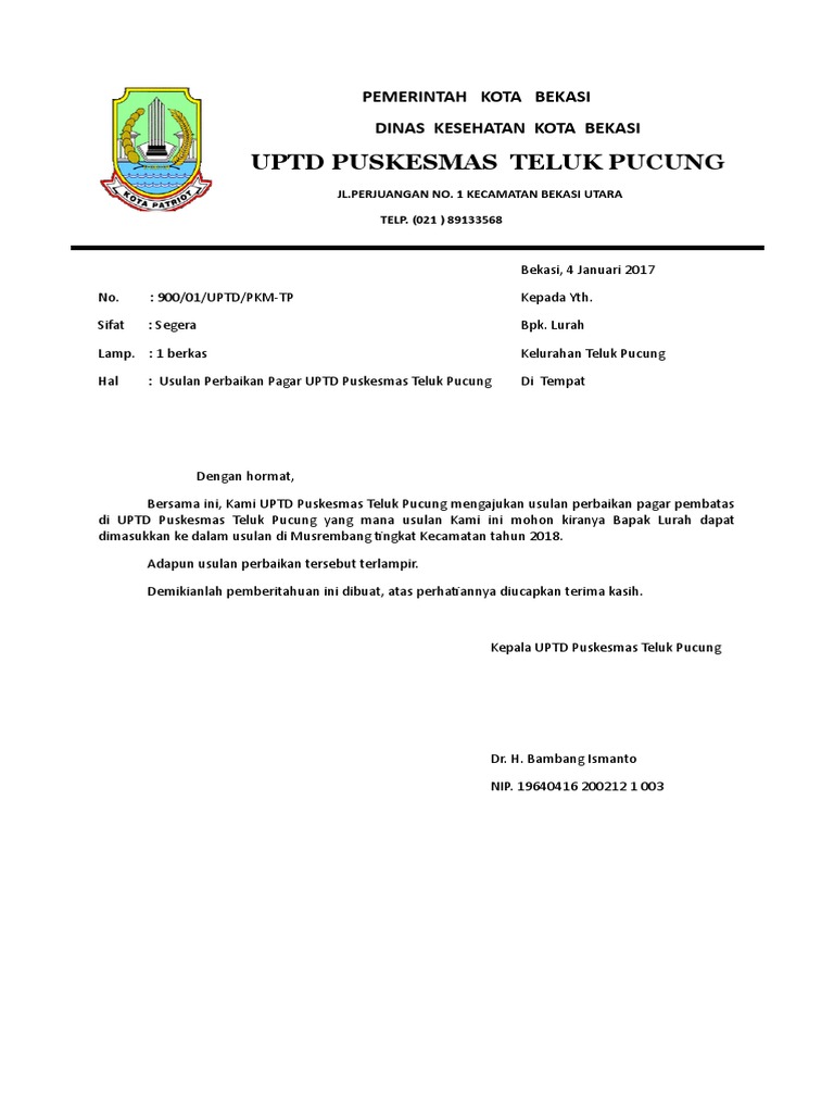 di UPTD Puskesmas Teluk Pucung yang mana usulan Kami ini mohon kiranya Bapak Lurah dapat