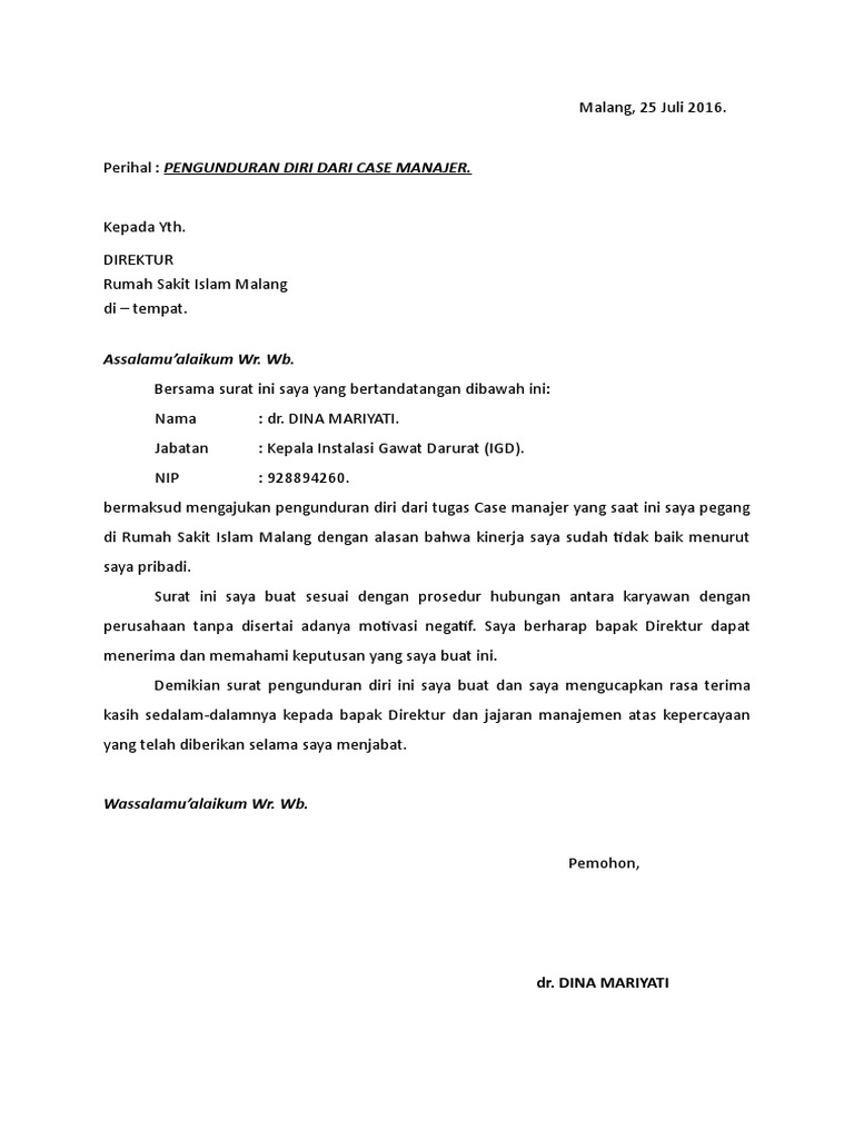 Perihal : PENGUNDURAN DIRI DARI CASE MANAJER.