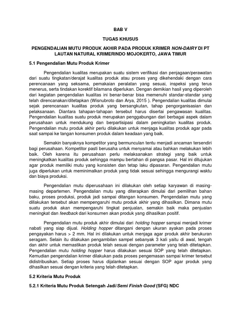 Tabel 5.1 Standar Mutu Produk Setengah Jadi NDC di PT Lautan Natural Krimerindo