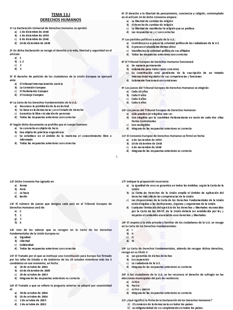 b) La obligatoriedad de su cumplimiento en todos los países.E.E. a) 29 de octubre de 2004 d) Ninguna de las respuestas anteriores es correcta b) 10 de diciembre de 2005 c) 29 de octubre de 2003 20º A los ciudadanos de la U. d) La finalización de las monarquías absolutas 2 .12º Dicho Convenio fue signado en: 17º Indique la proposición incorrecta: a) Roma a) La igualdad de sexo se garantiza en todos los ámbitos. g) 3 h) 4 18º El respeto a la vida privada y familiar de los ciudadanos de la U. c) Las disposiciones de la Carta de los Derechos Fundamentales de la Unión 13º El número de jueces que designa cada país en el Tribunal Europeo de están dirigidas a las instituciones. de la Unión deberá ser establecida por ley y f) 2 respetar el contenido esencial de esos derechos y libertades. además de recoger dichos derechos. órganos y organismos de la Unión. se les reconoce el derecho de sufragio en las d) Ninguna de las respuestas anteriores es correcta elecciones municipales del país de residencia: a) Activo 16º El Tratado a que se refiere la pregunta anterior se adoptó por unanimidad b) Pasivo el: c) Activo y pasivo a) 30 de octubre de 2004 d) Ninguna de las respuestas anteriores es correcta b) 18 de octubre de 2004 c) 2 de octubre de 2003 21º ¿Qué significó la firma de la Declaración de los Derechos Humanos? d) 2 de octubre de 2002 a) El comienzo de la democracia en todos los países. c) La internacionalización de estos derechos. según la Carta de la b) París Unión.E. se recoge en la Carta de los Derechos Fundamentales: 14º Uno de los valores que se recogen en la Carta de los Derechos a) I Fundamentales de la Unión Europea es: b) II a) Dignidad c) IV b) Libertad d) III c) Solidaridad d) Todas las respuestas anteriores son correctas 19º La Carta de Derechos Fundamentales. recoge en su título V: 15º El Tratado por el que se instituye una Constitución para Europa fue firmado a) Las garantías de dichos derechos por los Jefes de Estado o de Gobierno de los 25 estados miembros más los 3 b) Su suspensión candidatos en ese momento.FF. en fecha: c) La ciudadanía de la U. Derechos Humanos será de: d) Cualquier limitación del ejercicio de los derechos y libertades reconocidos e) 1 por la Carta de los DD. c) La haya b) La Carta de Derechos de la Unión amplía el ámbito de aplicación del d) Berlín Derecho más allá de las competencias de la Unión.