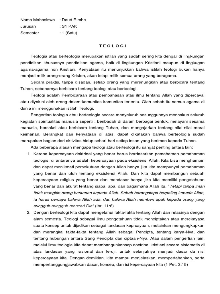 Teologi adalah Pembicaraan atau pembahasan atau ilmu tentang Allah yang dipercayai