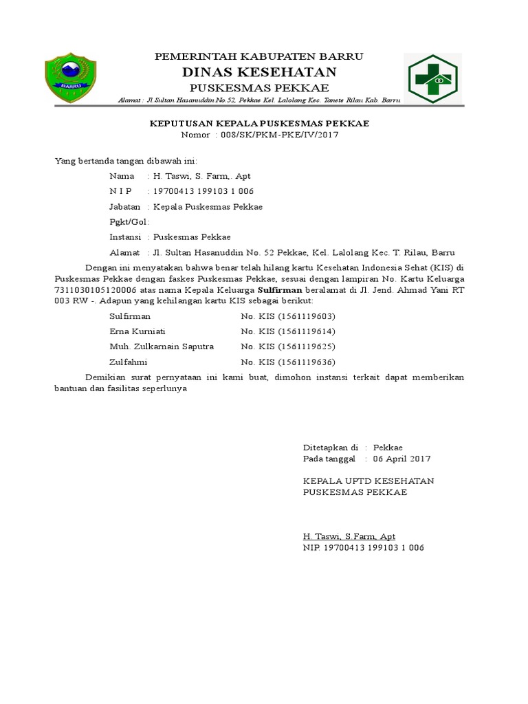 Puskesmas Pekkae dengan faskes Puskesmas Pekkae, sesuai dengan lampiran No. Kartu Keluarga