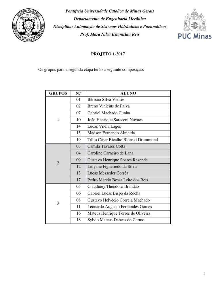 Pontifícia Universidade Católica de Minas Gerais Departamento de Engenharia Mecânica Disciplina: Automação de Sistemas Hidráulicos e Pneumáticos Prof. Mara Nilza Estanislau Reis